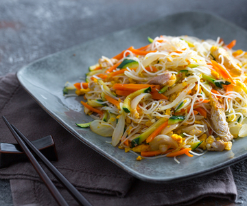 Main Courses Rice noodles with vegetables and caramelized chicken Rice noodles with vegetables and caramelized chicken are a main course that evokes the East, thanks to soy, almonds, honey, ginger, and lime. 4.3 Easy 25 min Kcal 335 READ RECIPE