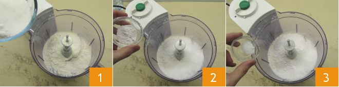 To make the 5-minute ricotta cake, place all the batter ingredients into a mixer: start with the flour and sugar 1, then continue with the baking powder 2 and salt 3.