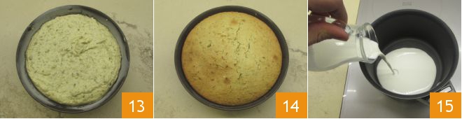 And level the surface with a spatula 13. Bake in a preheated static oven at 356°F for 50 minutes. Once baked, remove the cake from the oven 14 and let it cool slightly. Meanwhile, prepare the coating: pour the cream into a saucepan 15 and heat it until just before boiling.