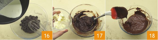 At this point, pour the hot cream over the dark chocolate: we used chocolate chips, but if you have a chocolate bar, you can chop it first 16. Stir with a whisk to melt it and create a cream. Incorporate the butter cut into pieces 17 and stir again until you obtain a fluid sauce 18.