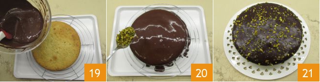 Flip the cake onto a cooling rack and cover it entirely with the chocolate sauce 19. Finally, sprinkle chopped pistachios on the surface 20. The 5-minute ricotta cake is ready to be enjoyed 21.
