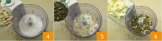 Next, add the peeled almonds 4 and shelled pistachios 5. Incorporate the butter cut into pieces 6