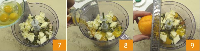 and the whole eggs 7, then flavor with rum 8 and grated orange zest 9. Blend the ingredients until fully combined.