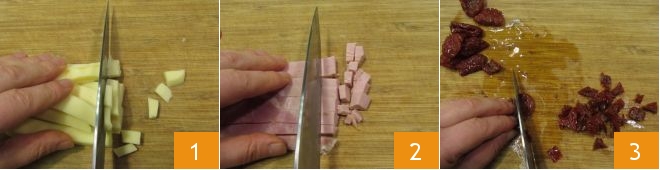 To prepare the 5-minute savory pie, first preheat the oven to 356°F in static mode. Then dice the provolone cheese 1 and cooked ham 2, drain the sun-dried tomatoes in oil and chop them into small pieces with a knife 3. Set the filling aside and focus on the batter.