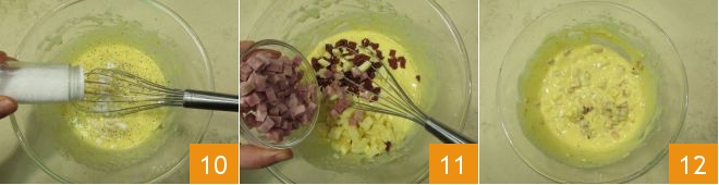 salt it 10, incorporate the filling of ham, cheese, and tomatoes 11, and mix once more to combine 12.