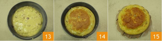 Butter and flour a 7-inch diameter cake pan, then pour the mixture in and gently shake the pan to level it 13. Bake the 5-minute savory pie in a preheated static oven at 356°F for 30 minutes. Once baked, take the pie out of the oven 14, let it cool slightly, and then remove it from the pan to serve it 15.