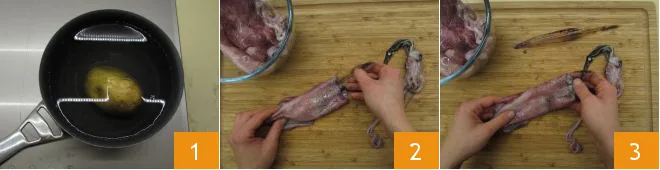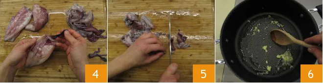 then remove the skin 4 and proceed to wash thoroughly. Finely chop the tentacles 5 and turn to the stove. Put a saucepan over heat, add a drop of oil and the grated garlic, and fry over low heat for a minute, stirring as you do so 6.