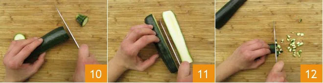 Wash, dry, and trim the zucchini 10, slice them about ¼ inch (4-5 mm) thick 11 and then cut them first into batons and then into cubes of the same size 12.