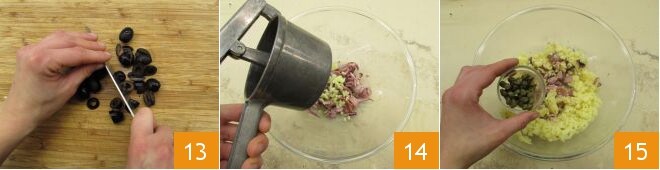 Next, chop the black olives 13 and prepare the filling. The potatoes should be cooked by this point. Peel and mash them with a potato masher directly into the bowl with the squid tentacles 14. Add the desalted capers 15,