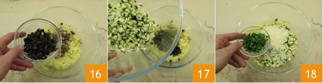 the chopped olives 16, the zucchini cubes 17, the Parmigiano Reggiano cheese, and some chopped parsley 18.