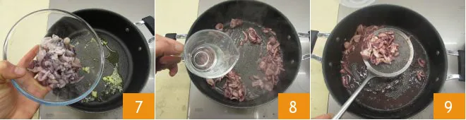 Turn up the heat a little and add the chopped tentacles 7. Fry them until they are nicely colored, then add 3 tbsp (50 g) of white wine 8 and simmer. Wait for the alcohol to evaporate, then drain the tentacles before setting them aside in a bowl 9.