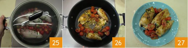 Cover with a lid and cook over medium heat for around 25 minutes 25, turning very gently a couple of times 26. Your Amalfi-style stuffed calamari will then be ready to serve 27!