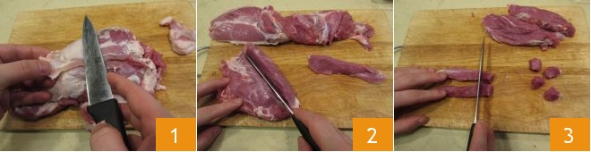 To prepare the arrosticini, start by taking the meat. Using a sharp knife, remove the fattier parts of the meat 1. Then, cut the meat into strips 2 and then into cubes of 1/2 inch thick 3.