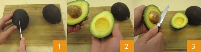 To prepare the avocado hummus, start with the avocado: cut it vertically 1, then divide it in half 2 and finally remove the stone ( 3).