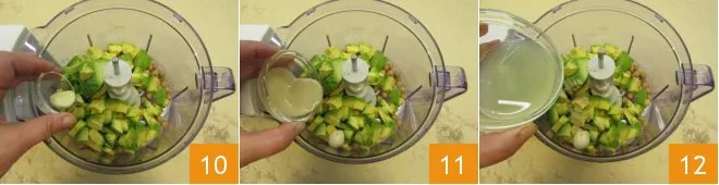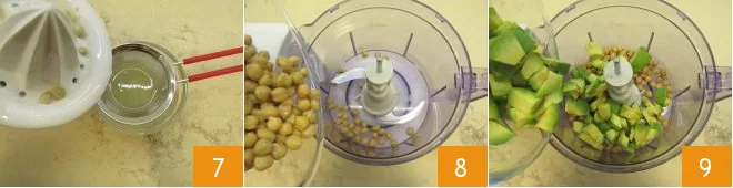 and filter the juice with a colander, collecting it in a small bowl 7. Take the mixer and pour in the drained the precooked chickpeas 8 and diced avocado 9.