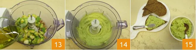 Finally, pour the oil 13 and turn the mixer on at medium speed, blending until you get a smooth cream without lumps 14. Transfer the avocado hummus to a serving bowl, adding a pinch of black and white sesame seeds 15. Your avocado hummus is ready to be enjoyed!