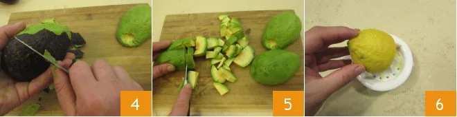 Peel the avocado 4 and finally cut it into cubes 5: you will have to obtain about 1 lb (450 g) of avocado pulp. Squeeze a lemon with a juicer 6