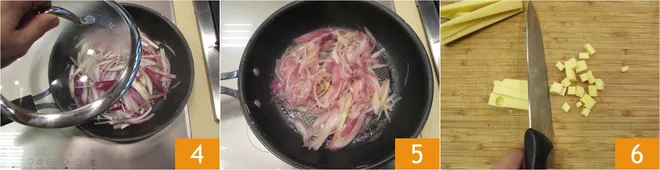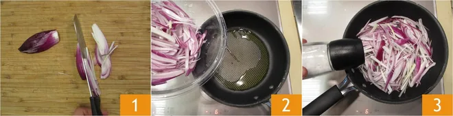 To prepare the baked frittata as a first step peel the onions and slice them thinly 2. Transfer them to a pan together with a drizzle of oil 2 and salt 3.