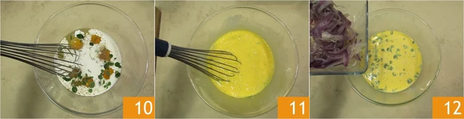 Mix vigorously with a whisk 10 trying to incorporate some air 11. When the onions have cooled down, add them to the egg mixture 12 and mix again.