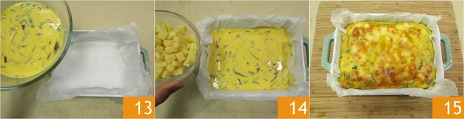 Then transfer into a large rectangular baking dish 10x7.5 inches lined with parchment paper 13. Arrange the cheese cubes evenly and bake in a preheated static oven at 375°F for 30 minutes. If it should not be golden brown enough, activate the grill for a couple of minutes at maximum power. Take the baked frittata out of the oven 15 and enjoy it while it's still hot!