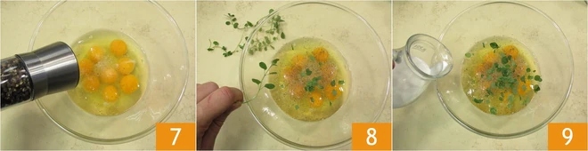 Now break the eggs into a large bowl, add salt, pepper 7, and some fresh oregano leaves 8. Also pour in the cream 9.