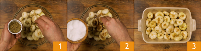 To prepare baked onions, place the peeled Borettane onions in a large bowl. Add the apple cider vinegar, brown sugar, and oregano 1. Add a pinch of salt 2 and a generous drizzle of oil. Mix everything well and transfer to a baking dish 3. Bake in a preheated static oven at 350°F for 50 minutes. Remove from the oven, let cool slightly, and serve your baked onions with the cooking juices.