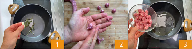 To prepare the tagliatelle nests, pour a drizzle of oil, garlic, and thyme sprigs into a saucepan and let it heat over low heat 1. Crumble the sausage by hand to form 1/2-inch (1 cm) balls more easily 2. Remove the herbs from the base and add the meatballs 3.