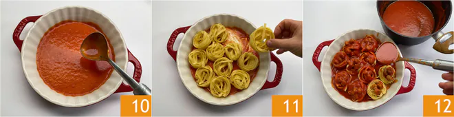 Pour the sauce into a baking dish 10 that measures 9 inches (23 cm) at the base and 11 inches (27 cm) at the top. Arrange the tagliatelle nests 11, cover with more sauce and meatballs 12.