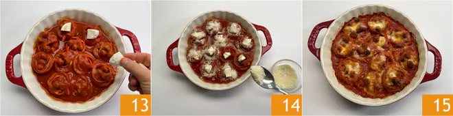 Sprinkle the surface with the fiordilatte mozzarella pieces 13 and grated Parmigiano Reggiano 14. Bake in a preheated convection oven at 390°F (200°C) for about 20 minutes. At the end of cooking, let it cool for a few minutes and serve with basil if desired.