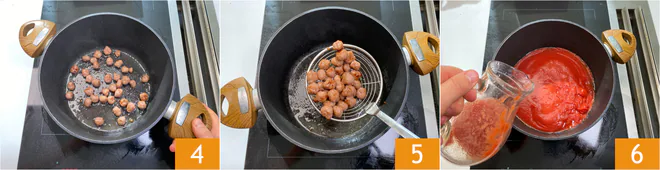 Sauté the meatballs over high heat 4. When well-sealed, remove the sausage and set aside 5, pour in the tomato sauce 6 and 17.6 oz (500 ml) of water.