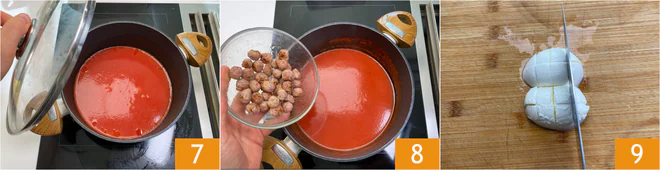 Add a pinch of salt, cover with the lid 7 and cook over medium heat for half an hour. After the time has passed, add the meatballs 8 and let them cook for just a few minutes. Meanwhile, cut the fiordilatte into pieces 9.