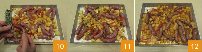 Season with the rosemary needles (10-11) and bake in a conventional oven preheated to 390°F (200°C) for 30-35 minutes. You can open the oven and stir from time to time to ensure the dish cooks evenly. Once cooked 12, serve the baked sausage and potatoes while still hot.