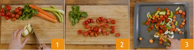 To prepare baked sea bass, start by cleaning the vegetables. Coarsely chop up the onion, the carrots and celery sticks 1, then cut the tomatoes in half and finely chop the parsley 2. Place the vegetables in a baking tray, grease and add salt and pepper to taste 3.