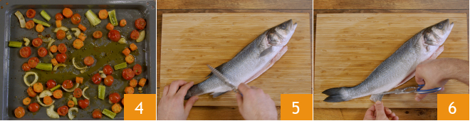 Bake the vegetables in a static oven preheated to 350°F for around 10 minutes 4. Clean the sea bass in the meantime. After skinning and gutting the fish, by running the blade of the knife down towards the head 5, remove all the fins: back, side and ventral ones 6.
