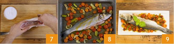 Place a pinch of salt and a bay leaf in the middle 7, then arrange the sea bass on an oven tray, grease the surface of the fish and bake for 15 minutes in the oven 9. Once ready, flavor with a few basil leaves and your baked sea bass is ready to be served 9.