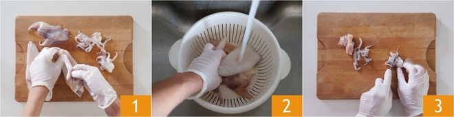 To prepare baked stuffed calamari, first handle the cleaning of the calamari. Remove the head and wings from the calamari. Remove eyes and beak from the head and strip the skin from the tentacles and body 1. After rinsing everything well 2, cut both the wings and tentacles into small pieces 3, leaving the sac whole.
