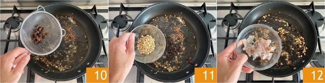 Also add the squeezed raisins 10 and pine nuts 11. Finally, add the small pieces of calamari 12 and let them brown for a few minutes.