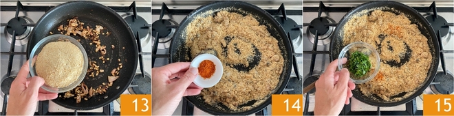 Turn off the heat and add the breadcrumbs 13, then season with salt, a pinch of chili pepper 14, and plenty of chopped parsley 15.