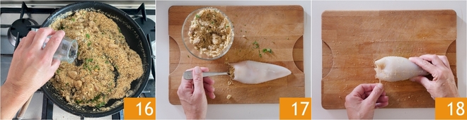Pour the water 16 and mix. This way, the filling will be softer and more moist. Take the calamari sacs and fill them with the mixture 17, then seal the ends using toothpicks 18.