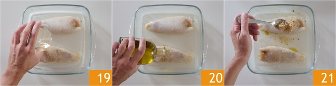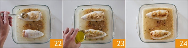 Place the calamari in a baking dish, then pour in the white wine 19 and a drizzle of oil 20. Add some of the leftover filling on top 21.