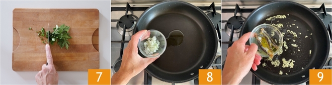 Also chop a bunch of parsley 7 and set it aside. Pour a drizzle of oil in a pan, add the chopped onion 8, and let it soften. Add the anchovies 9 and let them melt with the heat.