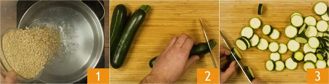 To prepare the barley salad with arugula pesto, green beans, and zucchini, first bring a pot of salted water to a boil and cook the barley for the time indicated on the package 1. Meanwhile, put another pot on the stove with salted water to boil for the vegetables and prepare the other ingredients: wash and trim the zucchini 2, then cut them into rounds 3.