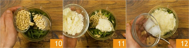 Now prepare the arugula pesto: wash and dry the arugula, then place it in a tall, narrow container along with the pine nuts 10, grated Parmigiano Reggiano cheese 11, and a couple of ice cubes 12.
