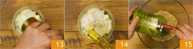 Salt, pepper 13 and add about 5 tablespoons of oil 14. Blend with an immersion blender to obtain a creamy and homogeneous sauce; if necessary, add more oil to achieve the desired consistency. Pour the arugula pesto into the bowl with the barley 15 and mix well.