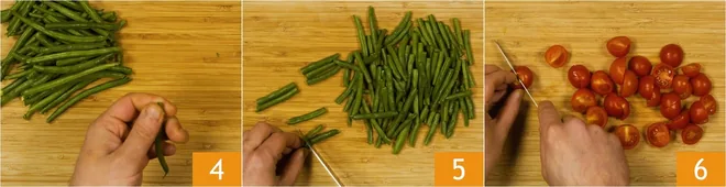 Trim the green beans as well 4 and cut them into 2-3 parts 5, then cut the cherry tomatoes in half 6.