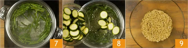 Add the green beans to the boiling water 7 and, after 5 minutes, also add the zucchini 8. Cook the vegetables for about 10 minutes; they should still be crunchy. Once the barley cooking time has elapsed, drain it into a large bowl 9.