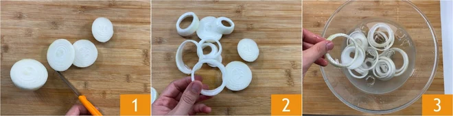 To prepare the onion rings, first clean the onions and cut them into 1/2 inch thick slices 1; then, without breaking them, separate the rings 2. Transfer them to a bowl with ice water 3 for 15 minutes. This step will help to mellow the taste of the onions and make the rings more crispy.