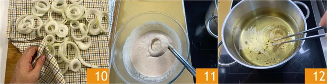 After 15 minutes, drain the onion rings and dry them well with a cloth 10. Be careful with this operation because if they remain moist, the batter may fall off during cooking; moreover, the oil could splatter. At this point, heat the oil in a pan to a temperature of 340°F. Take the batter and, using tongs, dip the first ring. Let the excess batter drip off 11 and immerse it in the hot oil 12.