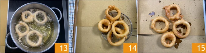 Continue like this, dipping a few rings at a time 13. Cook them for about 3 minutes, turning them a couple of times, until they are golden brown. Drain them on kitchen paper 14. Continue in this way until they are all fried and serve them still hot 15.