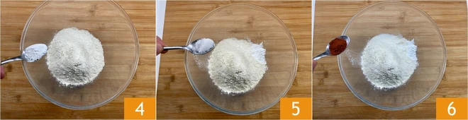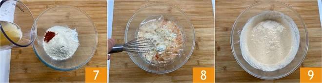 Meanwhile, prepare the batter. In a bowl, pour the flour, baking powder 4, salt 5, and paprika 6.